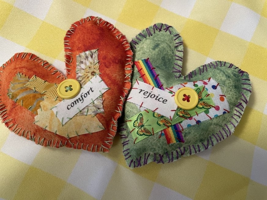 2 handmade "mended hearts," created with love by Anne Marie Bennett. Words: Comfort, RejoicePrice: $25.00