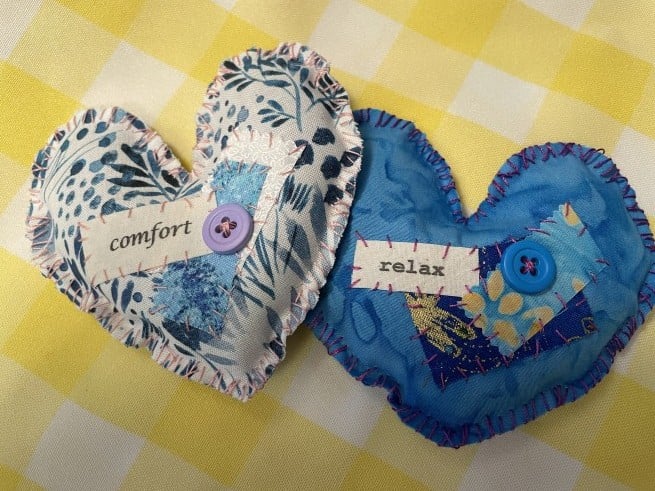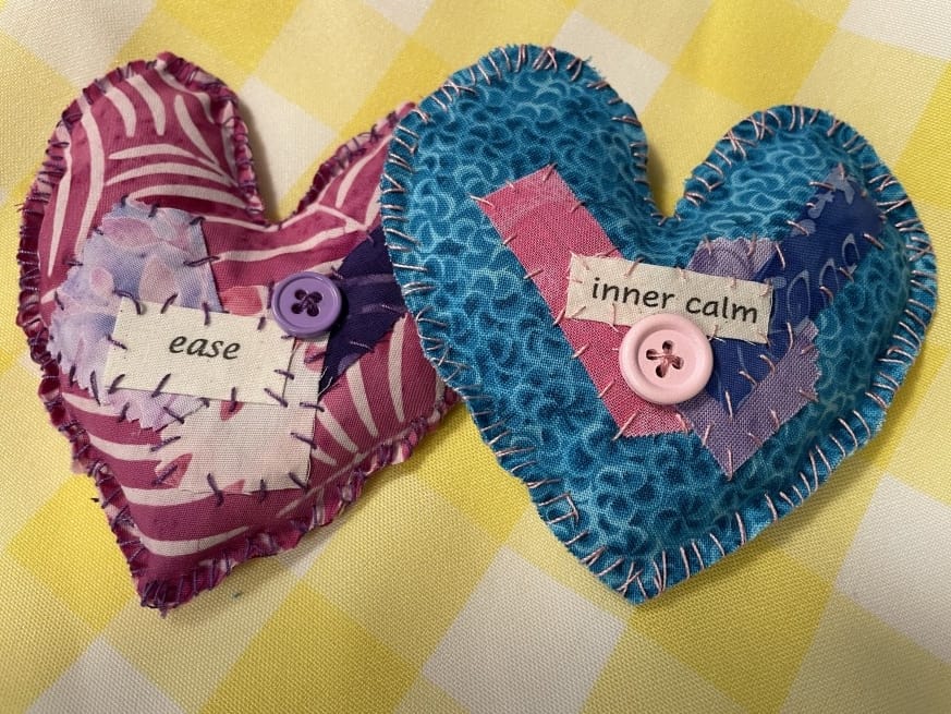 2 handmade "mended hearts," created with love by Anne Marie Bennett. Words: Comfort, RelaxPrice: $25.00
