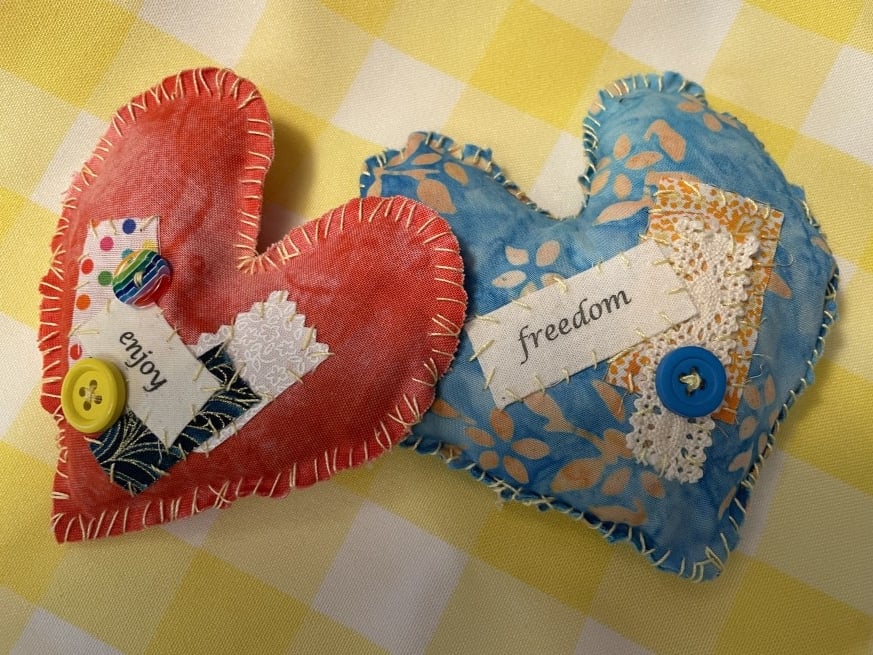 2 handmade "mended hearts," created with love by Anne Marie Bennett. Words: Enjoy, FreedomPrice: $25.00