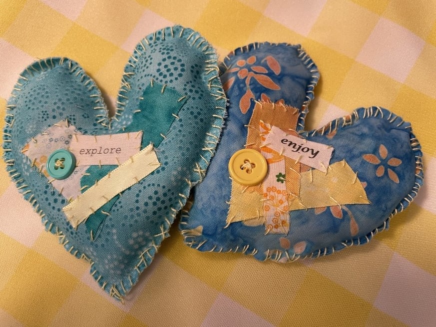2 handmade "mended hearts," created with love by Anne Marie Bennett. Words: Explore, EnjoyPrice: $25.00