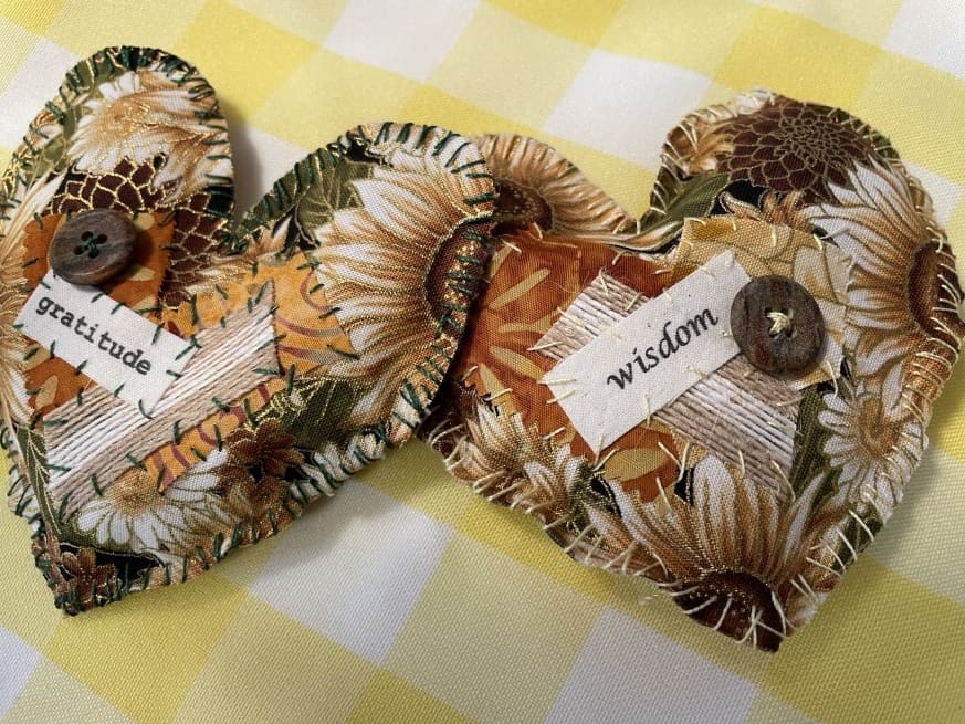 2 handmade "mended hearts," created with love by Anne Marie Bennett. Words: Gratitude, WisdomPrice: $25.00