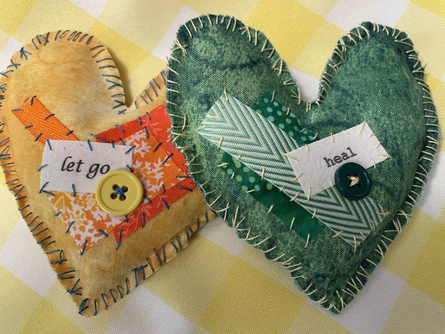 2 handmade "mended hearts," created with love by Anne Marie Bennett. Words: Let Go, HealPrice: $25.00