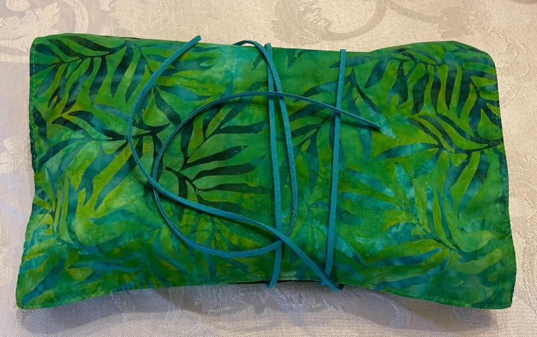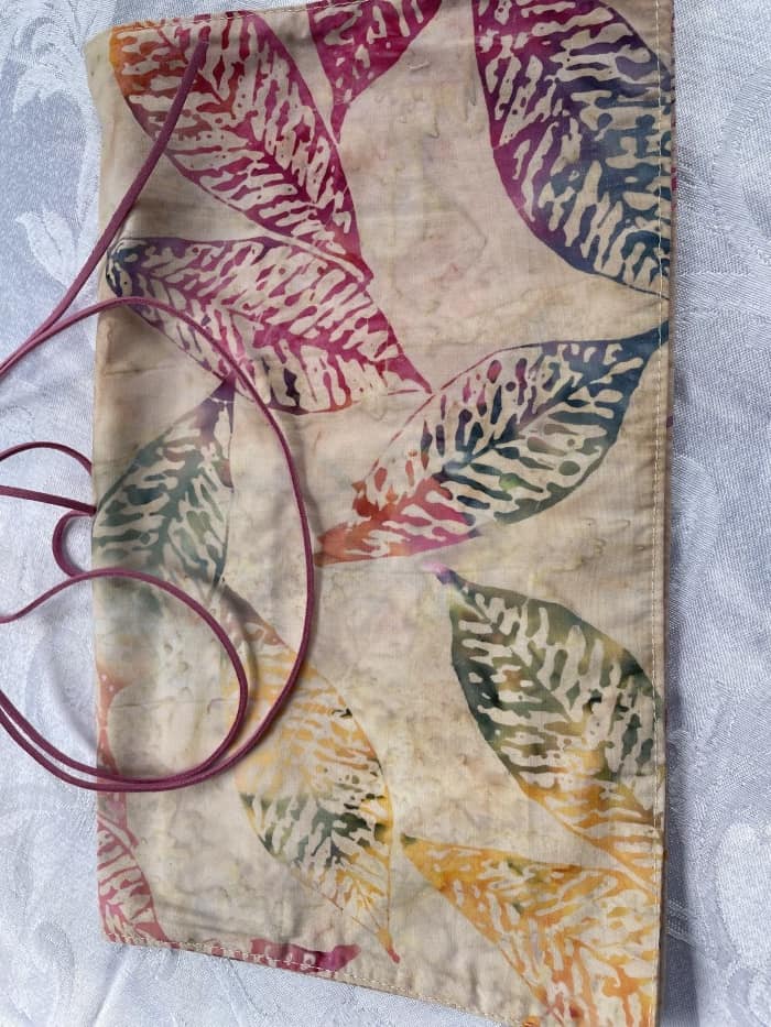 Soft ivory background with scattered batiked leaves in greens, yellows, deep purples and blues.Price: $20.00