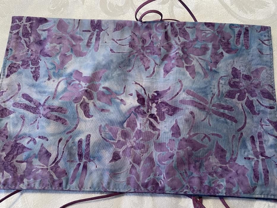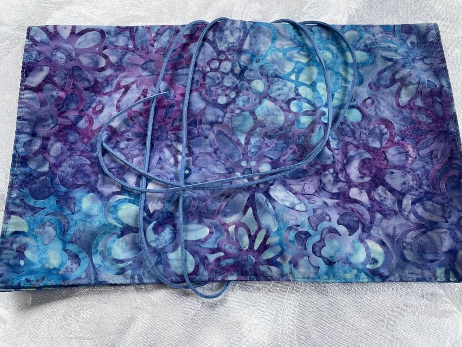 Soft blues and purples watercolor background with pretty flowery batik design.Price: $20.00