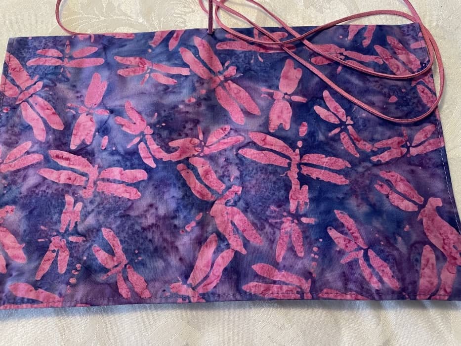 Soft watercolor purples in the background with batiked dragonflies in deep pinksPrice: $20.00