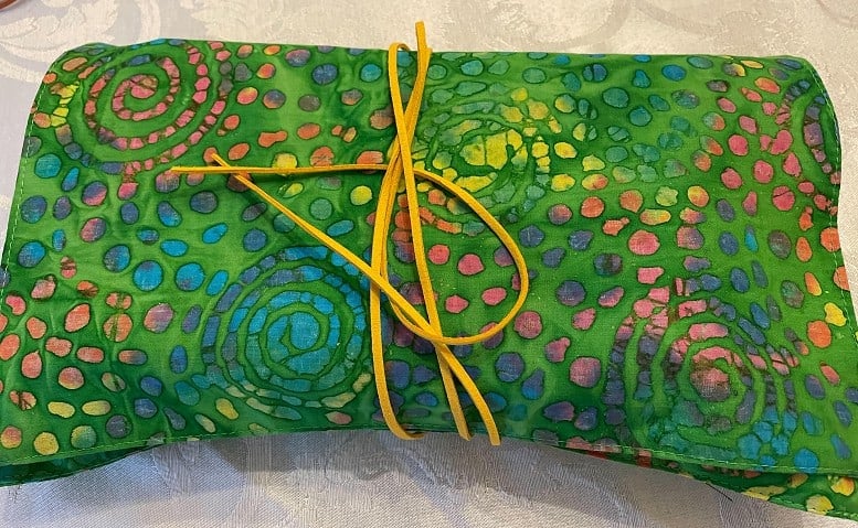Pretty batik butterflies on a summery background of greens, yellows, and rosy pinks. A soft, warm feeling.Price: $20.00
