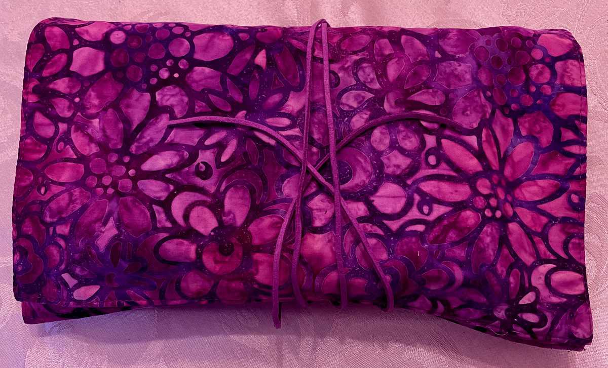 This one is more purple-purple than the image shows. The background is soft lavenders and pinks, and the flower images are batiked in dark purple.Price: $20.00