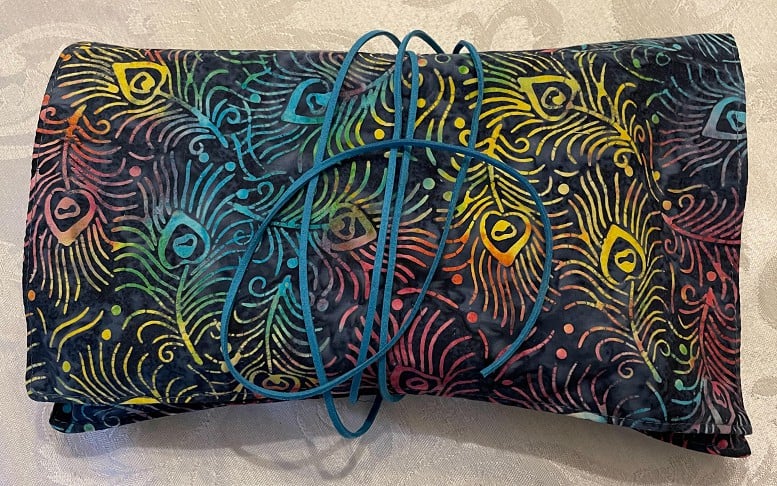 Very dark, soft blue background with bright rainbow peacock feathers sprinkled all over. Notice that the center of each feather looks like a heart!Price: $20.00