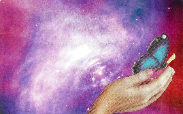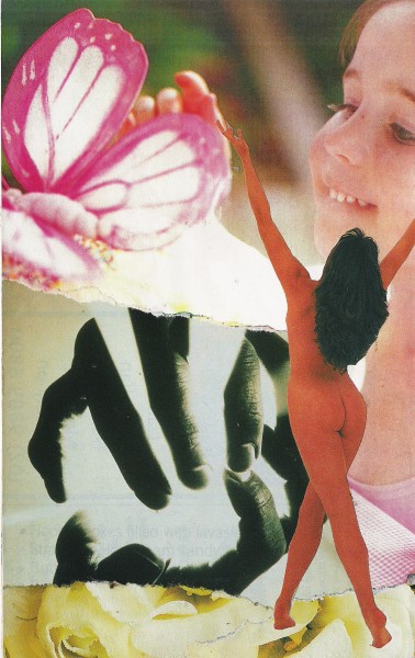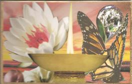 My experience with making a card to represent my SoulEssence has taught me once again about the power of "trusting the process" and waiting for the right image to find me. When I began making my SoulCollage deck (in 2004) it was prior to the introduction of the SoulEssence card to the deck. Upon my learning about the SoulEssence card I came upon an existing un-named card in my deck which I began to use as my SoulEssence card. The black and white image of the hands holding a ball of light seemed to match Seena's definition of the SoulEssence representing a "unique spark of Source" or a "spark of divinity". The naked woman could represent the unadulterated potential within and the innocent child looking at the butterfly could also represent the potential within us all to